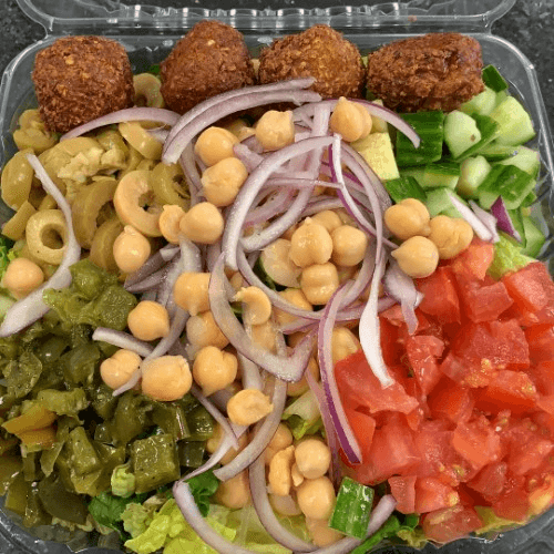Crispy romaine, diced tomatoes, diced cucumbers, diced red onions, roasted peppers, chick peas, green olives, tahini dressing, topped with falafel balls
