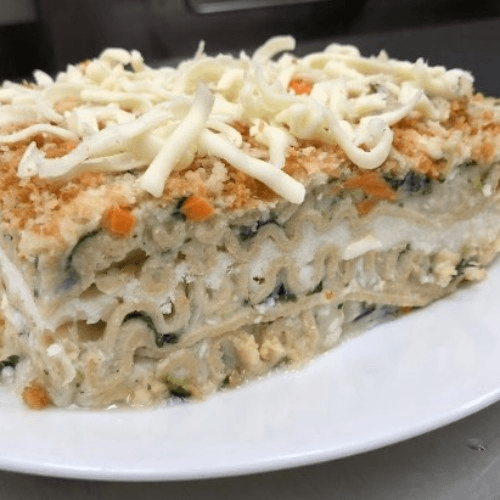 Roasted vegetables mixed with ricotta cheese & layered with lasagna noodles & marinara sauce