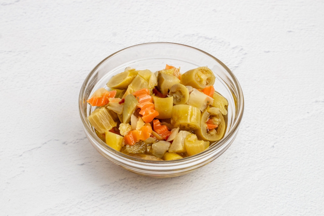 Chicago style hot Giardiniera peppers from Marconi. Traditionally served on an Italian Beef sandwich but goes well on everything!