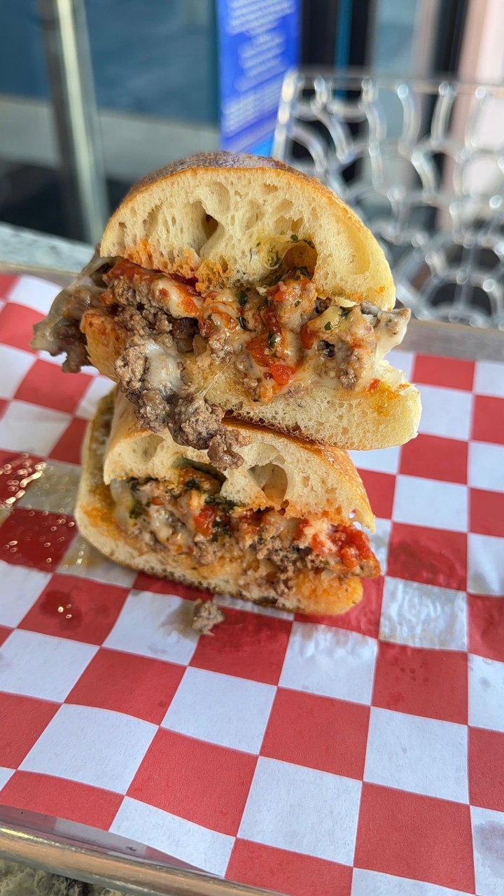 Ground American Wagyu seasoned like a meatball and chopped on a flat top with homemade marinara sauce, mozzarella cheese, parm reggiano and a basil oil drizzle.