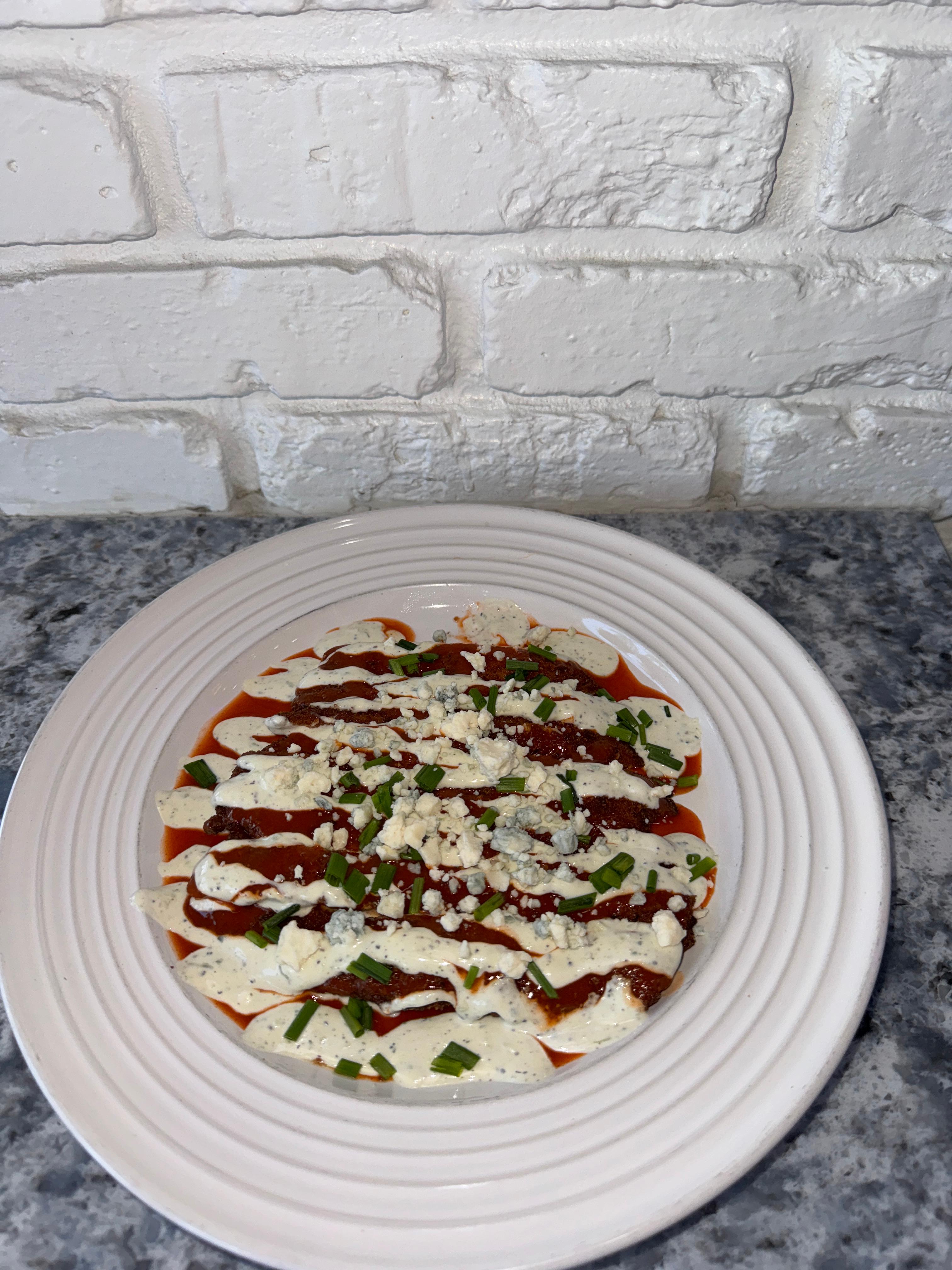 Chicken Cutlet topped with buffalo sauce, and blue cheese crumbles then finished with house-made ranch and chives.