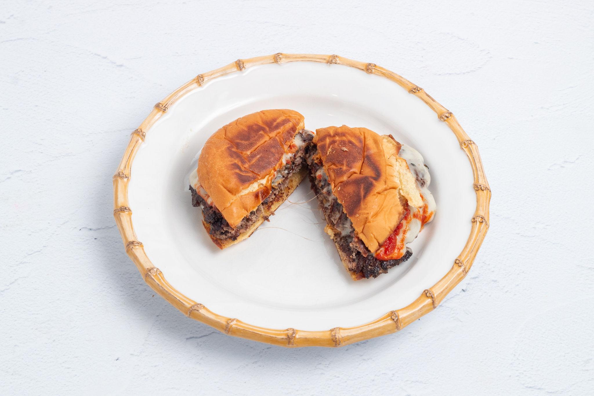 American Wagyu beef patties seasoned as meatballs then smashed into a griddle until crispy on the outside yet juicy on the inside and topped with mozzarella, marinara and freshly shave Parmigiano Reggiano on top of a Martin's potato roll.