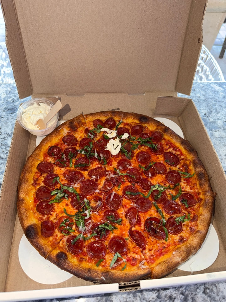 Our signature Caputo 00 cold proofed dough topped with hand milled California tomato sauce, romano cheese, mozzarella dice, EZZO pepperoni and finished with fresh basil, Mike's Hot Honey Drizzle, and freshly grated aged Parmigiano Reggiano.