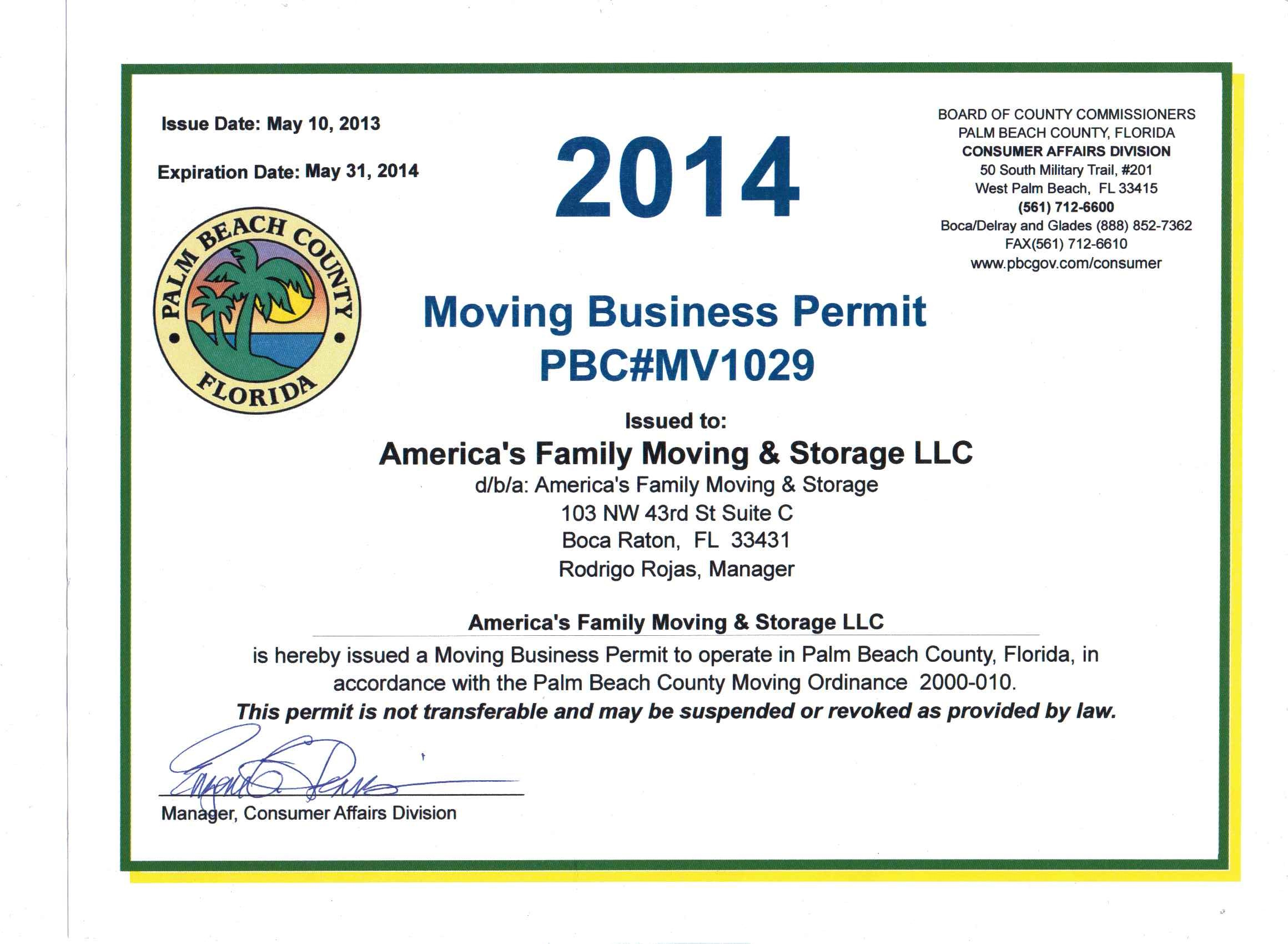 America's Family Moving & Storage is our local, fully licensed & insured, Family-Owned & operated. Moving company based in Boca Raton, Florida. We have been opened since 2012 and have grown exponentially fast due to our hard work, professional values, goals, and our steadfast dedication to our customers. We would like to introduce our business to you and welcome you into our Professional Family. If you are looking to move with a top-notch company, please take a look at who we are and feel free to call us with any questions. Our company and crew will supply you with anything you need to move, and I would be happy to provide you with a competitive, free-of-charge estimate to give you a more accurate quote for your specific move. We are your home, condominium, apartment, residential & commercial moving company and are pleased to offer a full line of moving and packing services, customized to fit your moving needs. We are not a large, over-grown company that has gotten too big to remember and focus on each and every individual customer and their satisfaction. We have our reputation on the line and will always work hard to make sure our clients and their belongings are happy and taken care of, no matter what. We have no hidden charges and don't require deposits. We only take payment after the entire move is finished and everyone is totally satisfied with their moving experience. Contact us today to discuss your current and future transportation and storage needs. We have the fleet of vehicles, trained drivers, and friendly staff to provide the best customer service in the business.